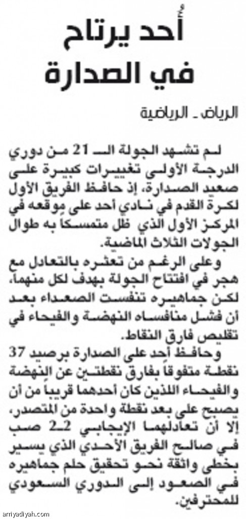 لم تشهد الجولة الـ 21 من دوري الدرجة الأولى تغييرات كبيرة على صعيد الصدارة، إذ حافظ الفريق الأول لكرة القدم في نادي أحد على موقعه في المركز الأول الذي ظل متمسكاً به طوال الجولات الثلاث الماضية.