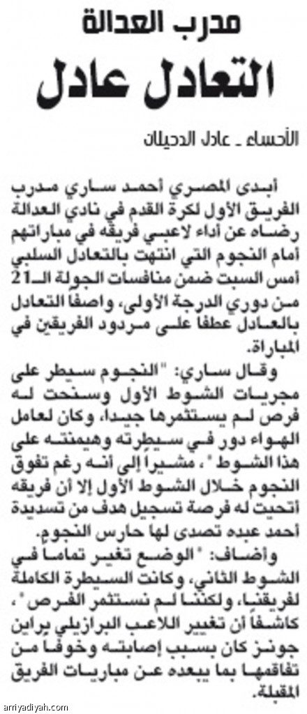 أبدى المصري أحمد ساري مدرب الفريق الأول لكرة القدم في نادي العدالة رضاه عن أداء لاعبي فريقه في مباراتهم أمام النجوم التي انتهت بالتعادل السلبي أمس السبت ضمن منافسات الجولة الـ21 من دوري الدرجة الأولى، واصفاً التعادل بالعادل عطفاً على مردود الفريقين في المباراة.