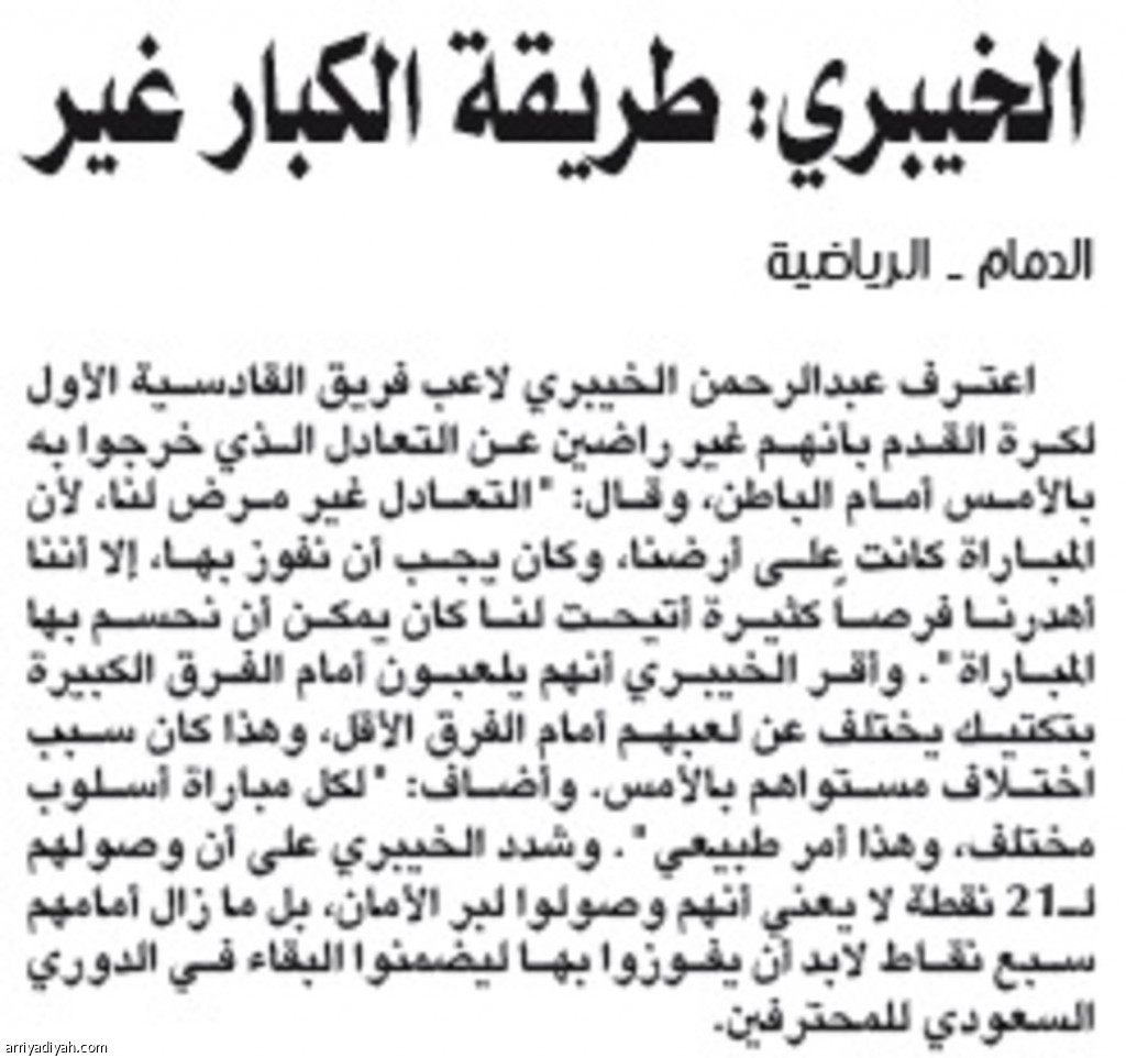 اعترف عبدالرحمن الخيبري لاعب فريق القادسية الأول لكرة القدم بأنهم غير راضين عن التعادل الذي خرجوا به بالأمس أمام الباطن، وقال: "التعادل غير مرض لنا، لأن المباراة كانت على أرضنا، وكان يجب أن نفوز بها، إلا أننا أهدرنا فرصاً كثيرة أتيحت لنا كان يمكن أن نحسم بها المباراة". وأقر الخيبري أنهم يلعبون أمام الفرق الكبيرة بتكتيك يختلف عن لعبهم أمام الفرق الأقل، وهذا كان سبب اختلاف مستواهم بالأمس. وأضاف: "لكل مباراة أسلوب مختلف، وهذا أمر طبيعي". وشدد الخيبري على أن وصولهم لـ٢١ نقطة لا يعني أنهم وصولوا لبر الأمان، بل ما زال أمامهم سبع نقاط لابد أن يفوزوا بها ليضمنوا البقاء في الدوري السعودي للمحترفين.