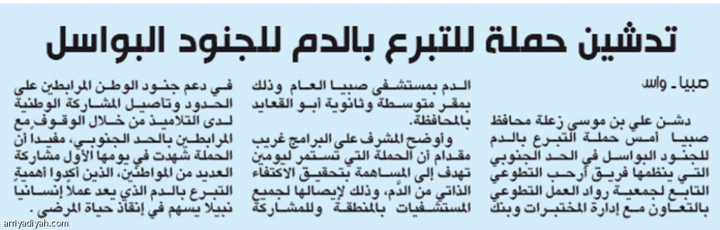 دشن علي بن موسى زعلة محافظ صبيا أمس حملة التبرع بالدم للجنود البواسل في الحد الجنوبي التي ينظمها فريق أرحب التطوعي التابع لجمعية رواد العمل التطوعي بالتعاون مع إدارة المختبرات وبنك الدم بمستشفى صبيا العام وذلك بمقر متوسطة وثانوية أبو القعايد بالمحافظة.