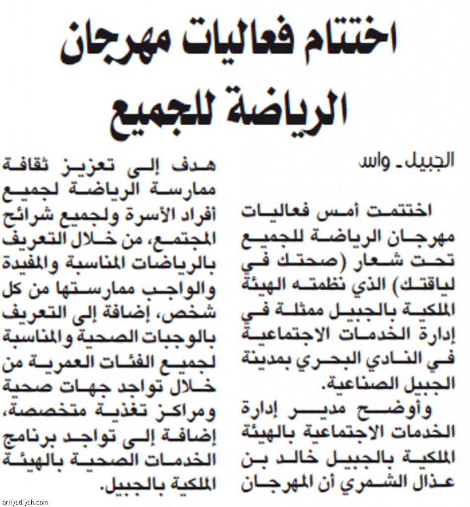 اختتمت أمس فعاليات مهرجان الرياضة للجميع تحت شعار (صحتك في لياقتك) الذي نظمته الهيئة الملكية بالجبيل ممثلة في إدارة الخدمات الاجتماعية في النادي البحري بمدينة الجبيل الصناعية.