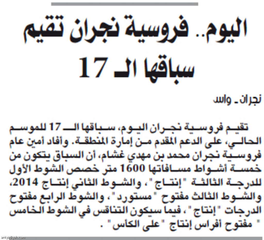 تقيم فروسية نجران اليوم، سباقها الـ 17 للموسم الحالي، على الدعم المقدم من إمارة المنطقة. وأفاد أمين عام فروسية نجران محمد بن مهدي غشام، أن السباق يتكون من خمسة أشواط مسافاتها 1600 متر خصص الشوط الأول للدرجة الثالثة "إنتاج"، والشوط الثاني إنتاج 2014، والشوط الثالث مفتوح "مستورد"، والشوط الرابع مفتوح الدرجات "إنتاج"، فيما سيكون التناقس في الشوط الخامس " مفتوح أفراس إنتاج "على الكأس" .