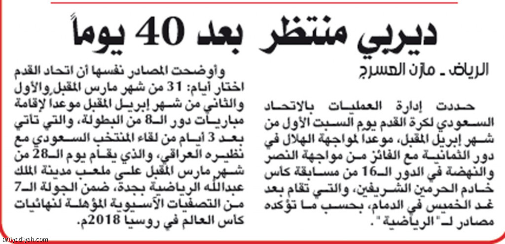 وأوضحت المصادر نفسها أن اتحاد القدم اختار أيام: 31 من شهر مارس المقبل والأول والثاني من شهر إبريل المقبل موعداً لإقامة مباريات دور الـ8 من البطولة، والتي تأتي بعد 3 أيام من لقاء المنتخب السعودي مع نظيره العراقي، والذي يقام يوم الـ28 من شهر مارس المقبل على ملعب مدينة الملك عبدالله الرياضية بجدة، ضمن الجولة الـ7 من التصفيات الآسيوية المؤهلة لنهائيات كأس العالم في روسيا 2018م.