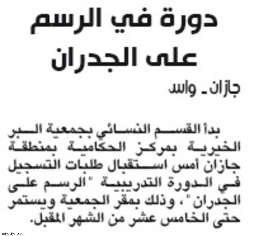 بدأ القسـم النسائي بجمعية الــبر الخيرية بمركز الحكامية بمنطقة جازان أمس اسـتقبال طلبات التسجيل في الدورة التدريبية "الرسم على الجدران"، وذلك بمقر الجمعية ويستمر حتى الخامس عشر من الشهر المقبل.