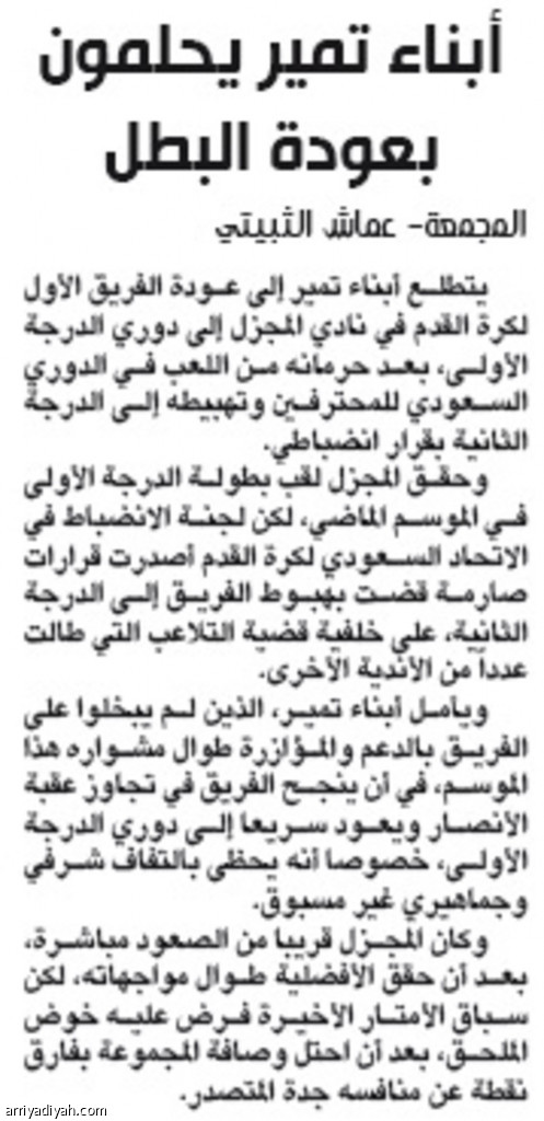 يتطلع أبناء تمير إلى عودة الفريق الأول لكرة القدم في نادي المجزل إلى دوري الدرجة الأولى، بعد حرمانه من اللعب في الدوري السعودي للمحترفين وتهبيطه إلى الدرجة الثانية بقرار انضباطي.