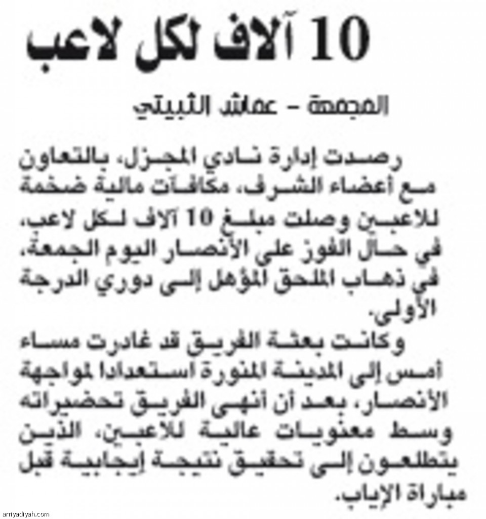 رصدت إدارة نادي المجزل، بالتعاون مع أعضاء الشرف، مكافآت مالية ضخمة للاعبين وصلت مبلغ 10 آلاف لكل لاعب، في حال الفوز على الأنصار اليوم الجمعة، في ذهاب الملحق المؤهل إلى دوري الدرجة الأولى.
