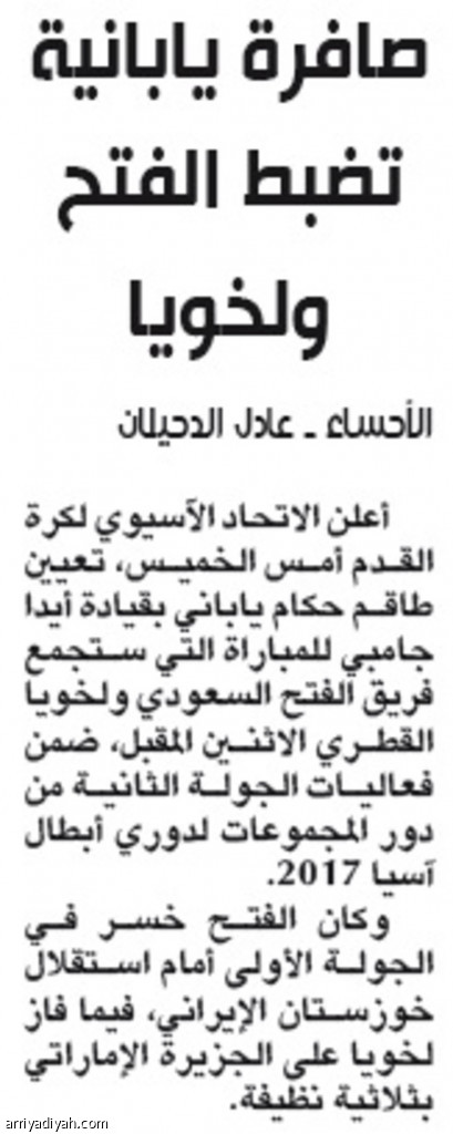 أعلن الاتحاد الآسيوي لكرة القدم أمس الخميس، تعيين طاقم حكام ياباني بقيادة أيدا جامبي للمباراة التي ستجمع فريق الفتح السعودي ولخويا القطري الاثنين المقبل، ضمن فعاليات الجولة الثانية من دور المجموعات لدوري أبطال آسيا 2017.