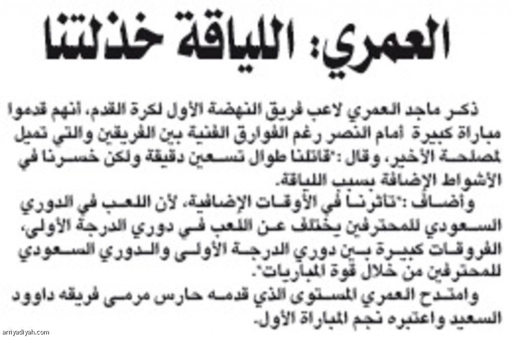 ذكر ماجد العمري لاعب فريق النهضة الأول لكرة القدم، أنهم قدموا مباراة كبيرة أمام النصر رغم الفوارق الفنية بين الفريقين والتي تميل لمصلحة الأخير، وقال :”قاتلنا طوال تسعين دقيقة ولكن خسرنا في الأشواط الإضافة بسبب اللياقة.