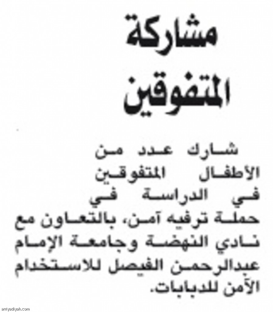 شارك عدد من الأطفال المتفوقين في الدراسة في حملة ترفيه آمن، بالتعاون مع نادي النهضة وجامعة الإمام عبدالرحمن الفيصل للاستخدام الآمن للدبابات.
