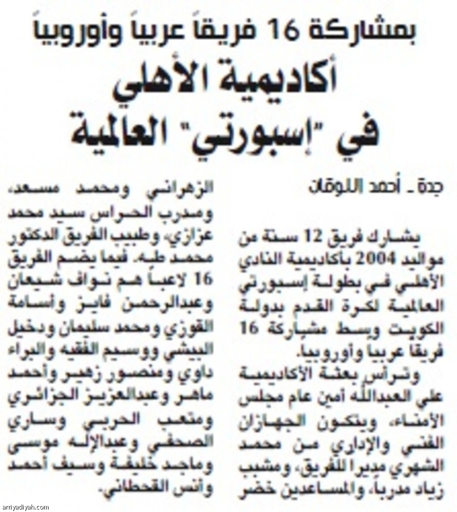 يشارك فريق 12 سنة من مواليد 2004 بأكاديمية النادي الأهلي في بطولة إسبورتي العالمية لكرة القدم بدولة الكويت وسط مشاركة 16 فريقاً عربياً وأوروبياً.