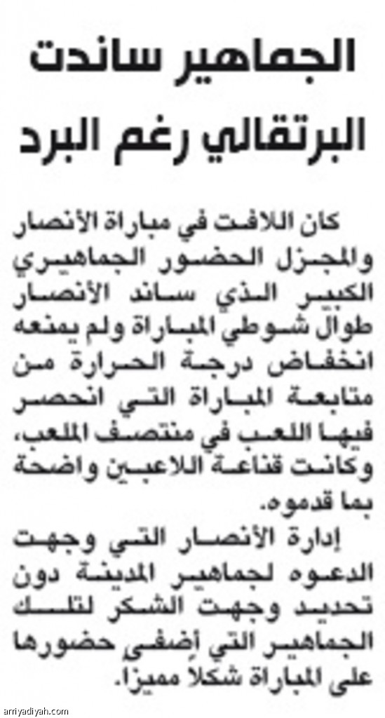 إدارة الأنصار التي وجهت الدعوه لجماهير المدينة دون تحديد وجهت الشكر لتلــك الجماهير التي أضفى حضورها على المباراة شكلاً مميزاً.