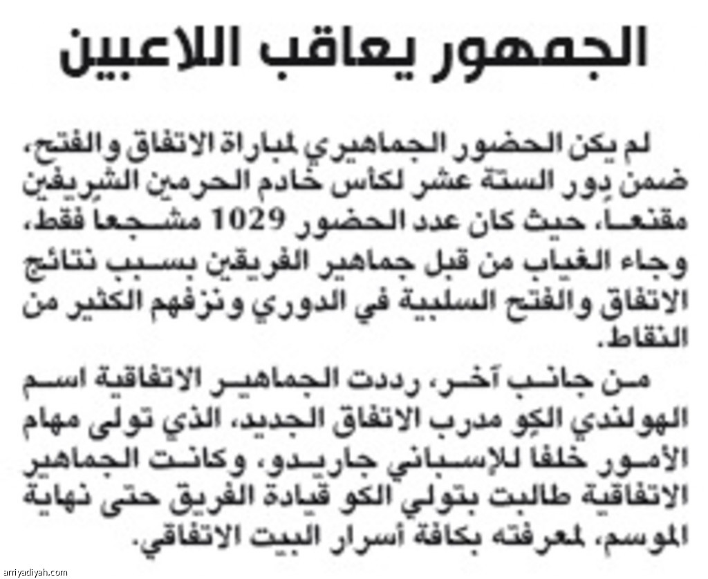 لم يكن الحضور الجماهيري لمباراة الاتفاق والفتح، ضمن دور الستة عشر لكأس خادم الحرمين الشريفين مقنعاً، حيث كان عدد الحضور ١٠٢٩ مشجعاً فقط، وجاء الغياب من قبل جماهير الفريقين بسبب نتائج الاتفاق والفتح السلبية في الدوري ونزفهم الكثير من النقاط.