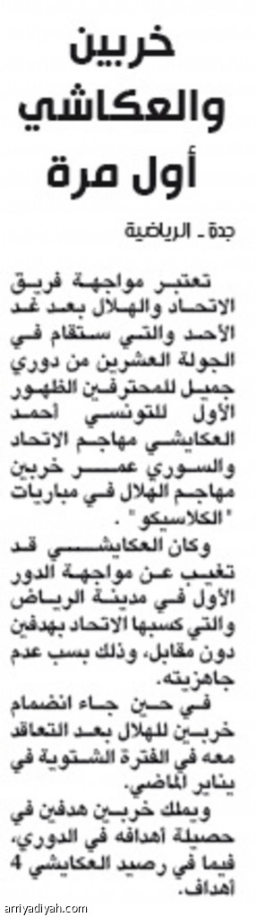 تعتبر مواجهة فريق الاتحاد والهلال بعد غد الأحد والتي ستقام في الجولة العشرين من دوري جميل للمحترفين الظهور الأول للتونسي أحمد العكايشي مهاجم الاتحاد والسوري عمـــر خربين مهاجم الهلال في مباريات "الكلاسيكو" .