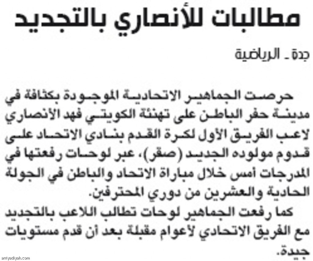 حرصت الجماهير الاتحادية الموجودة بكثافة في مدينة حفر الباطن على تهنئة الكويتي فهد الأنصاري لاعب الفريق الأول لكرة القدم بنادي الاتحاد على قدوم مولوده الجديد (صقر)، عبر لوحات رفعتها في المدرجات أمس خلال مباراة الاتحاد والباطن في الجولة الحادية والعشرين من دوري المحترفين.