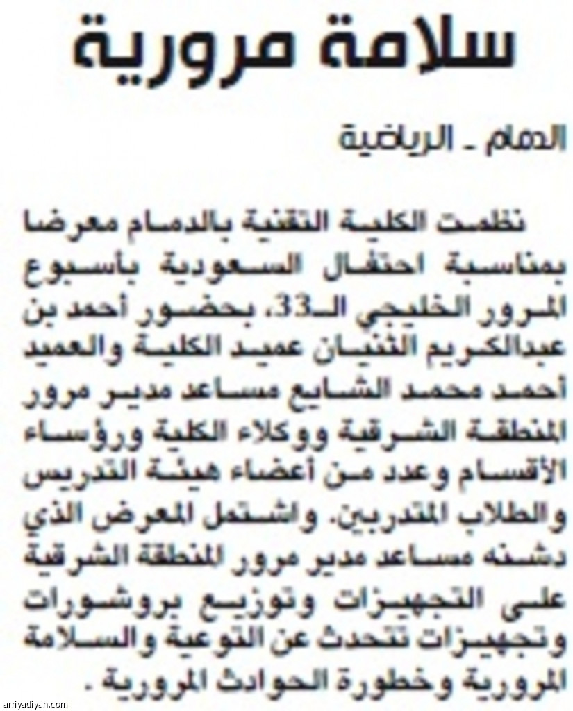 نظمت الكلية التقنية بالدمام معرضا بمناسبة احتفال السعودية بأسبوع المرور الخليجي الـ33، بحضور أحمد بن عبدالكريم الثنيان عميد الكلية والعميد أحمد محمد الشايع مساعد مدير مرور المنطقة الشرقية ووكلاء الكلية ورؤساء الأقسام وعدد من أعضاء هيئة التدريس والطلاب المتدربين. واشتمل المعرض الذي دشنه مساعد مدير مرور المنطقة الشرقية على التجهيزات وتوزيع بروشورات وتجهيزات تتحدث عن التوعية والسلامة المرورية وخطورة الحوادث المرورية .