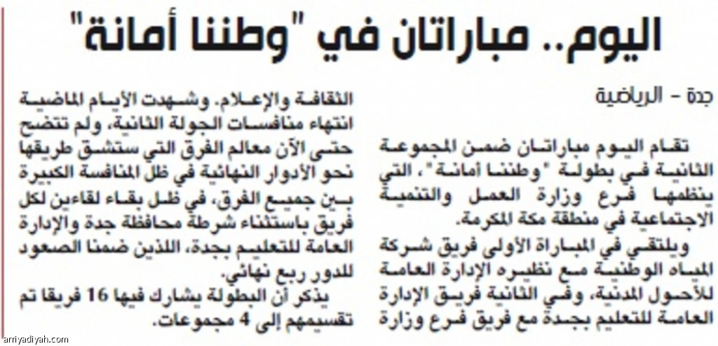 تقام اليوم مباراتان ضمن المجموعة الثانية في بطولة "وطننا أمانة"، التي ينظمها فرع وزارة العمل والتنمية الاجتماعية في منطقة مكة المكرمة.