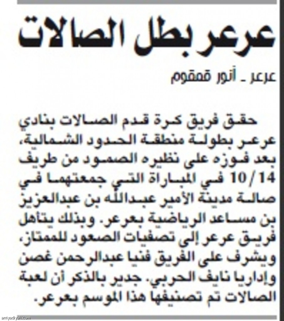 حقق فريق كرة قدم الصالات بنادي عرعر بطولة منطقة الحدود الشمالية، بعد فوزه على نظيره الصمود من طريف 10/14 في المباراة التي جمعتهما في صالة مدينة الأمير عبدالله بن عبدالعزيز بن مساعد الرياضية بعرعر. وبذلك يتأهل فريق عرعر إلى تصفيات الصعود للممتاز، ويشرف على الفريق فنيا عبدالرحمن غصن وإداريا نايف الحربي. جدير بالذكر أن لعبة الصالات تم تصنيفها هذا الموسم بعرعر.