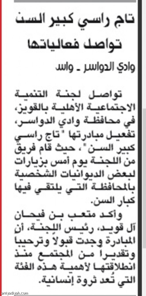 تواصل لجنة التنمية الاجتماعية الأهلية بالقويز، في محافظة وادي الدواسر، تفعيل مبادرتها "تاج راسي كبير السن"، حيث قام فريق من اللجنة يوم أمس بزيارات لبعض الديوانيات الشخصية بالمحافظة التي يلتقي فيها كبار السن.