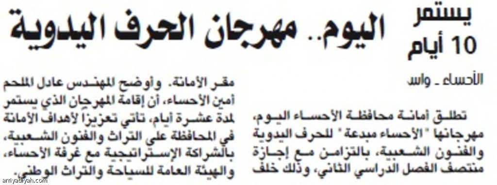 تطلق أمانة محافظة الأحساء اليوم، مهرجانها "الأحساء مبدعة" للحرف اليدوية والفنون الشعبية، بالتزامن مع إجازة منتصف الفصل الدراسي الثاني، وذلك خلف مقر الأمانة. وأوضح المهندس عادل الملحم أمين الأحساء، أن إقامة المهرجان الذي يستمر لمدة عشرة أيام، تأتي تعزيزاً لأهداف الأمانة في المحافظة على التراث والفنون الشعبية، بالشراكة الإستراتيجية مع غرفة الأحساء، والهيئة العامة للسياحة والتراث الوطني.