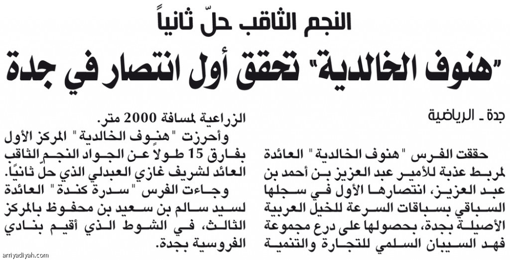 حققت الفرس "هنوف الخالدية" العائدة لمربط عذبة للأمير عبد العزيز بن أحمد بن عبد العزيز، انتصارها الأول في سجلها السباقي بسباقات السرعة للخيل العربية الأصيلة بجدة، بحصولها على درع مجموعة فهد السيبان السلمي للتجارة والتنمية الزراعية لمسافة 2000 متر.