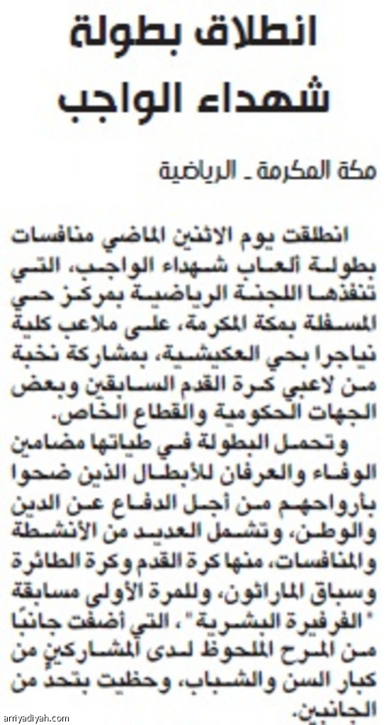انطلقت يوم الاثنين الماضي منافسات بطولة ألعاب شهداء الواجب، التي تنفذها اللجنة الرياضية بمركز حي المسفلة بمكة المكرمة، على ملاعب كلية نياجرا بحي العكيشية، بمشاركة نخبة من لاعبي كرة القدم السابقين وبعض الجهات الحكومية والقطاع الخاص.