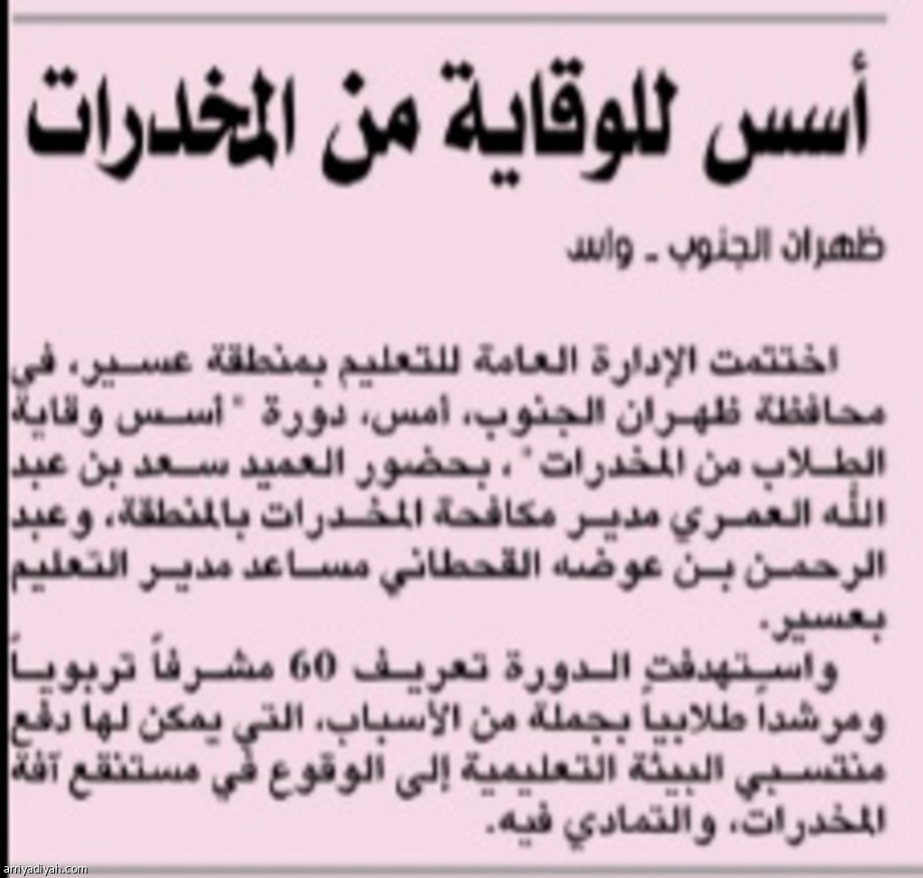 اختتمت الإدارة العامة للتعليم بمنطقة عسير، في محافظة ظهران الجنوب، أمس، دورة "أسس وقاية الطلاب من المخدرات"، بحضور العميد سعد بن عبد الله العمري مدير مكافحة المخدرات بالمنطقة، وعبد الرحمن بن عوضه القحطاني مساعد مدير التعليم بعسير.