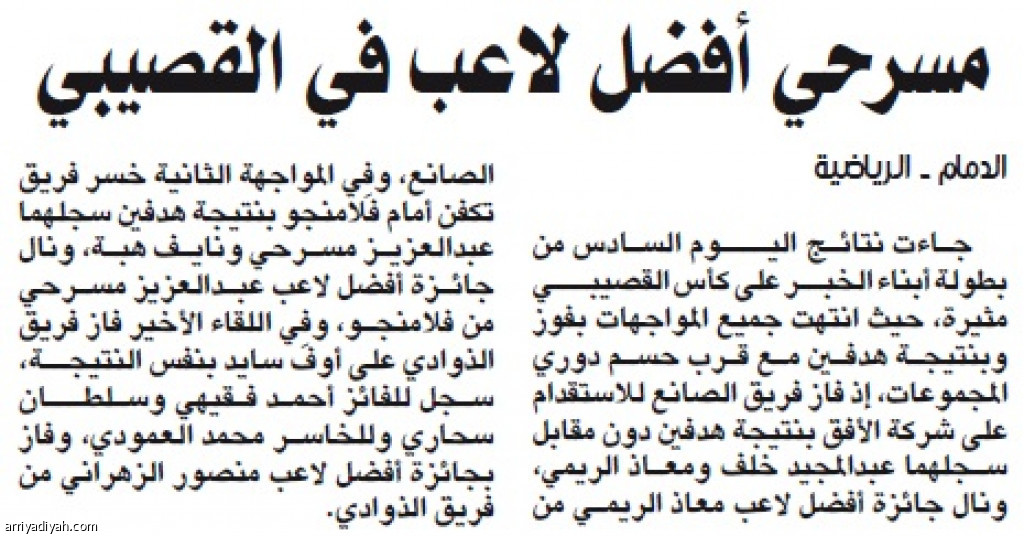 جاءت نتائج اليـــوم السادس من بطولة أبناء الخبــر على كأس القصيبـــي مثيرة، حيث انتهت جميع المواجهات بفوز وبنتيجة هدفين مع قرب حسم دوري المجموعات، إذ فاز فريق الصانع للاستقدام على شركة الأفق بنتيجة هدفين دون مقابل سجلهما عبدالمجيد خلف ومعاذ الريمي، ونال جائزة أفضل لاعب معاذ الريمـي من الصانع، وفِي المواجهة الثانية خسر فريق تكفن أمام فلامنجو بنتيجة هدفين سجلهما عبدالعزيز مسرحي ونايف هبة، ونال جائزة أفضل لاعب عبـدالعزيز مسرحي من فلامنجو، وفِي اللقاء الأخير فاز فريق الذوادي على أوف سايد بنفس النتيجــة، سجل للفائز أحمد فـقيهي وسلطـــان سحاري وللخاسر محمد العمودي، وفاز بجائزة أفضل لاعب منصور الزهراني من فريق الذوادي.