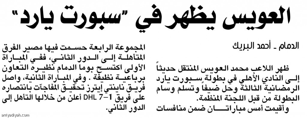ظهر اللاعب محمد العويس المنتقل حديثاً إلى النادي الأهلي في بطولة سبورت يارد الرمضانية الثالثة وحل ضيفاً وتسلم وسام البطولة من قبل اللجنة المنظمة.