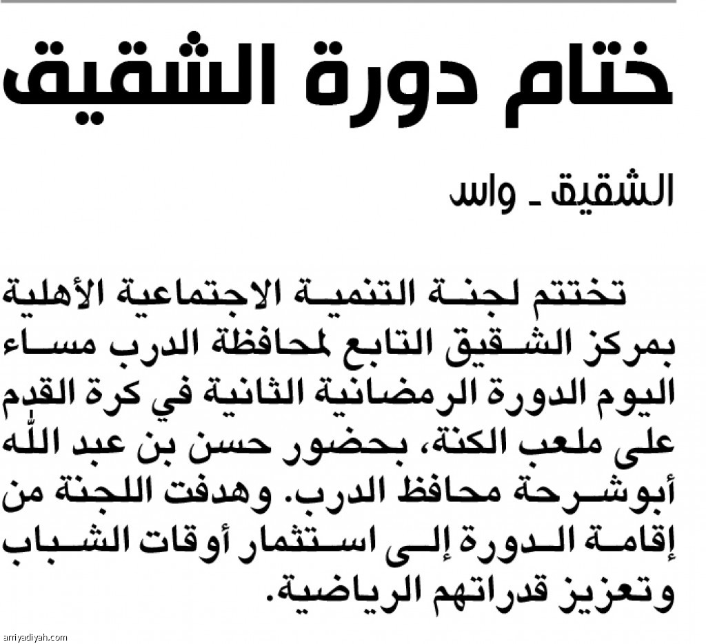تختتم لجنة التنمية الاجتماعية الأهلية بمركز الشقيق التابع لمحافظة الدرب مساء اليوم الدورة الرمضانية الثانية في كرة القدم على ملعب الكنة، بحضور حسن بن عبد الله أبوشرحة محافظ الدرب. وهدفت اللجنة من إقامة الدورة إلى استثمار أوقات الشباب وتعزيز قدراتهم الرياضية.