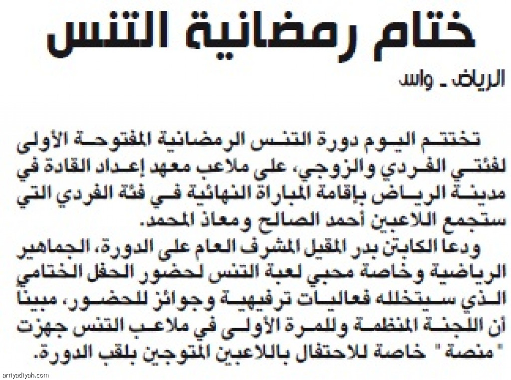 تختتم اليوم دورة التنس الرمضانية المفتوحة الأولى لفئتي الفردي والزوجي، على ملاعب معهد إعداد القادة في مدينة الرياض بإقامة المباراة النهائية في فئة الفردي التي ستجمع اللاعبين أحمد الصالح ومعاذ المحمد.