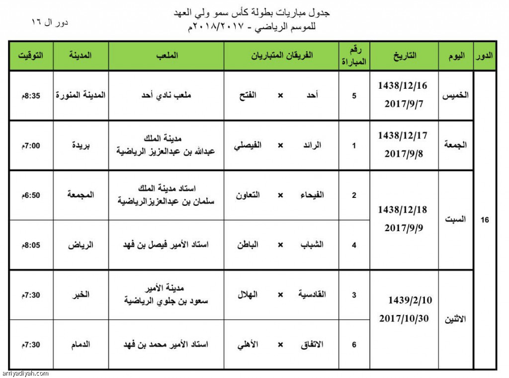 أعلن الاتحاد السعودي لكرة القدم اليوم مواعيد مباريات دور الـ 16 للموسم الجديد من كأس ولي العهد 2017-2018.
