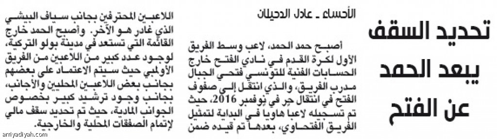 أصبح حمد الحمد، لاعب وسط الفريق الأول لكرة القدم في نادي الفتح خارج الحسابات الفنية للتونسي فتحي الجبال مدرب الفريق، والذي انتقل إلى صفوف الفتح في انتقال حر في نوفمبر 2016، حيث تم تسجيله لاعباً هاوياً في البداية لتمثيل الفريق الفتحاوي، بعدها تم قيده ضمن اللاعبين المحترفين بجانب سياف البيشي الذي غادر هو الآخر. وأصبح الحمد خارج القائمة التي تستعد في مدينة بولو التركية، لوجود عدد كبير من اللاعبين من الفريق الأولمبي حيث سيتم الاعتماد على بعضهم بجانب بعض اللاعبين المحليين والأجانب، بجانب وجود ترشيد كبير بخصوص الجوانب المادية، حيث تم تحديد سقف مالي لإتمام الصفقات المحلية والخارجية.