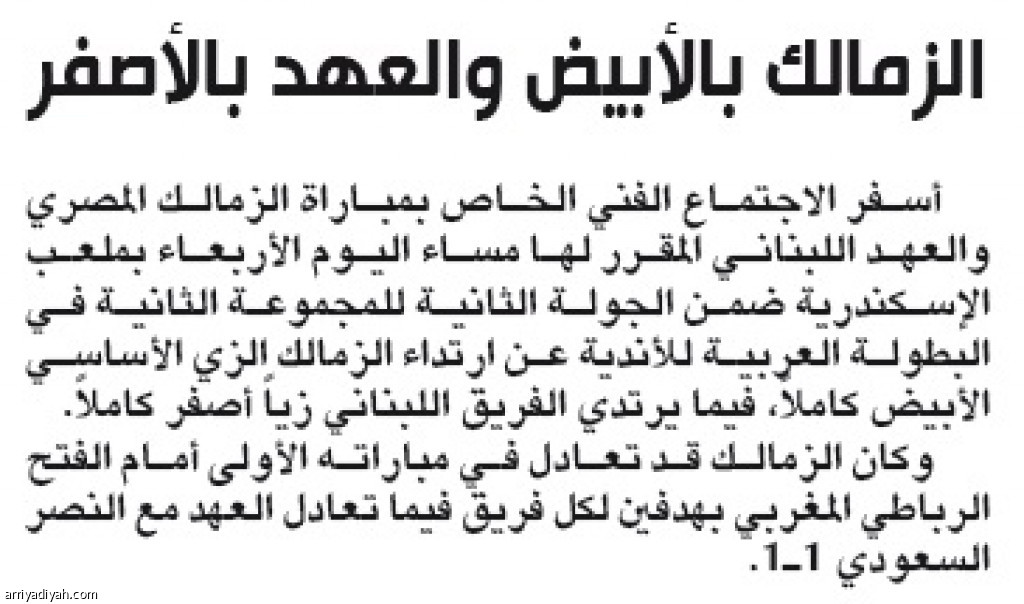 أسفر الاجتماع الفني الخاص بمباراة الزمالك المصري والعهد اللبناني المقرر لها مساء اليوم الأربعاء بملعب الإسكندرية ضمن الجولة الثانية للمجموعة الثانية في البطولة العربية للأندية عن ارتداء الزمالك الزي الأساسي الأبيض كاملاً، فيما يرتدي الفريق اللبناني زياً أصفر كاملاً.