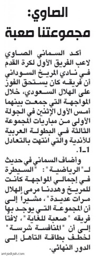 أكد السماني الصاوي لاعب الفريق الأول لكرة القدم في نادي المريخ السوداني أن فريقه كان يستحق الفوز على الهلال السعودي، خلال المواجهة التي جمعت بينهما أمس الأول الإثنين في الجولة الأولى من مباريات المجموعة الثالثة في البطولة العربية للأندية والتي انتهت بالتعادل 1ـ1.