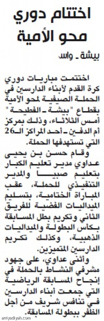 اختتمت مباريات دوري كرة القدم لأبناء الدارسين في الحملة الصيفية لمحو الأمية بقطاع "بيشة ـ الفطيحة" أمس الثلاثاء، وذلك بمركز أم الدفين ـ أحد المراكز الـ26 التي تستهدفها الحملة.