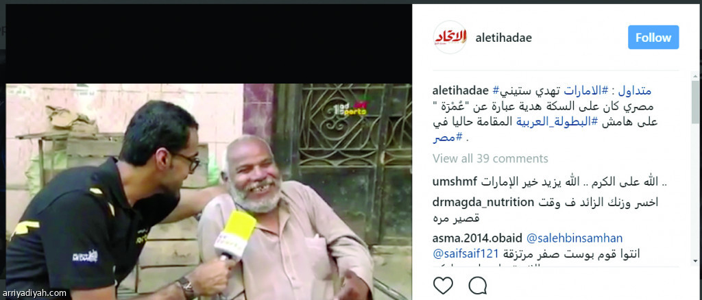 أهدت قناة أبوظبي الرياضية من خلال أحد برامجها، مواطناً مصرياً في العقد السادس من عمره، رحلة للعمرة مدفوعة التكاليف متضمنة تذاكر السفر والفندق والتنقل، وذلك على هامش البطولة العربية المقامة في جمهورية مصر العربية.