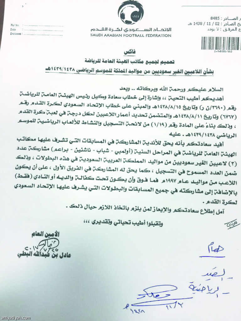 وأضاف في خطابه، أنه يحق للاعب المسجل المشاركة في الفريق الأول، مشترطاً أن يكون من مواليد عام 1997م فما فوق، وأن يكون تحت كفالة والديه أو النادي فقط، بالإضافة إلى مشاركته في كافة المسابقات والبطولات التي يشرف عليها الاتحاد السعودي لكرة القدم.