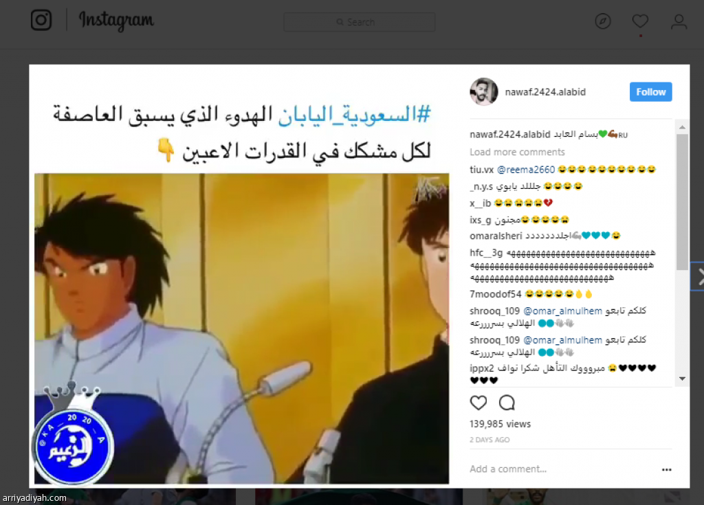 نشر نواف العابد، صانع ألعاب المنتخب السعودي الأول لكرة القدم، مقطع فيديو متداول عبر حسابه على موقع "إنستجرام" لمسلسل الكابتن ماجد الكرتوني، والذي يظهر فيه شخصية "بسام" اللاعب العنيف، في أحد المؤتمرات الصحفية، يُجيب عن أسئلة أحد الصحفيين، عندما سأله: هناك من يشكك في قدرات لاعبينا في التأهل إلى التصفيات النهائية، وعلق العابد لكل مشكك في قدرات اللاعبين، رابطًا ذلك بالمجهود الكبير الذي بذلوه بعد نجاح لاعبي المنتخب في التأهل لمونديال روسيا 2018 ، وردّهم على جميع من شكك في قدراتهم.