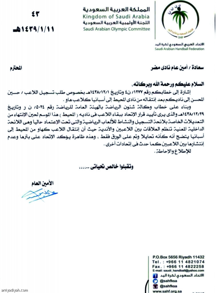 وجاء الرفض في خطاب مرسل من الأمين العام لاتحاد كرة اليد، أكد فيه أن القرار جاء بناءً على خطاب وكالة شؤون الرياضة في الهيئة العامة للرياضة، والذي يؤيد فيه قرار الاتحاد بالإبقاء على اللاعب في ناديه المحيط حتى نهاية الموسم الحالي، إلى حين الانتهاء من التعديلات الخاصة بلائحة التسجيل والنشاط للألعاب الرياضية، والتي هي تحت الاعتماد حاليًّا.