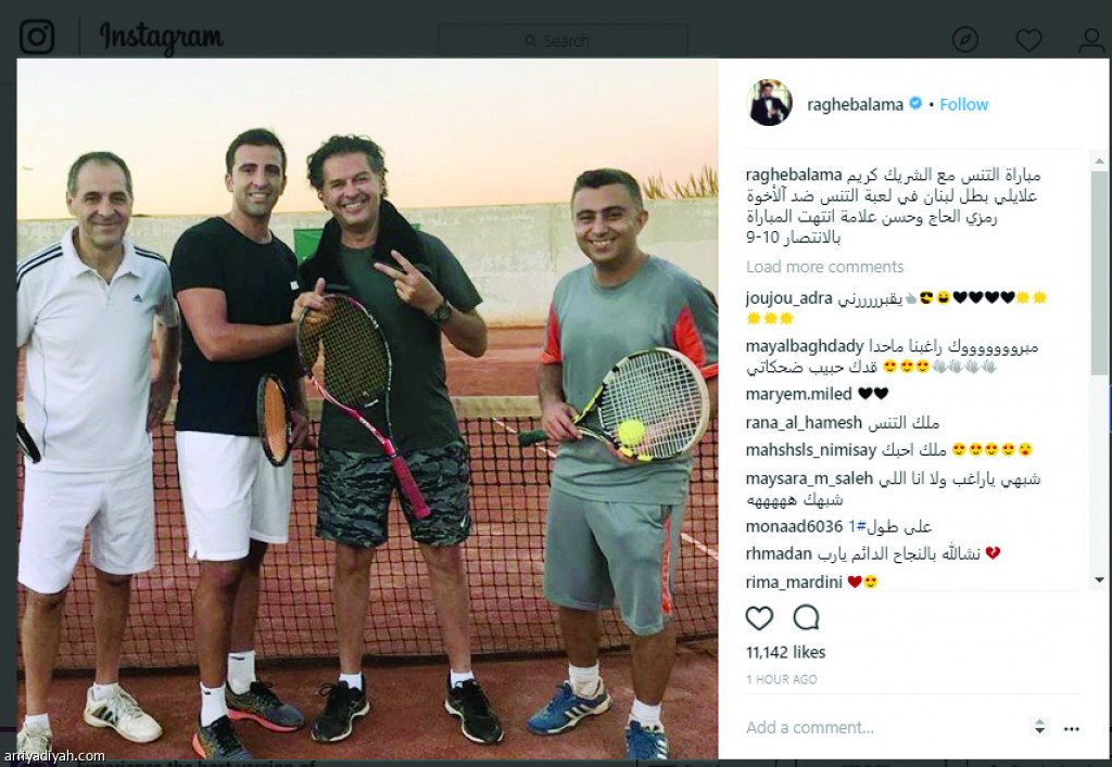 نشر الفنان اللبناني راغب علامة، صورة له عبر حسابه على موقع التواصل الاجتماعـي انســتجرام، عقب فراغه من مباراة في لعبة التنس الأرضي في مدينة صيدا اللبنانية، مكوناً ثنائياً مع اللاعب كريم علايلي بطل لبنان في التنس الأرضي، وانتهت اللعبة بفوز الثنائي راغب وكريم، على أصدقائهما، وعلق المعجبون على حساب راغب بطرافة، بأنهم يتمنون رؤية نجمهم في بطولة ويمبلدون الدولية، يذكر أن هذه ليست المرة الأولى التي ينشر فيها راغب صوراً وهو يمارس الأنشطة الرياضية، حيث أنه مولع بلعبة التنس الأرضــي، والرياضـات المائية.