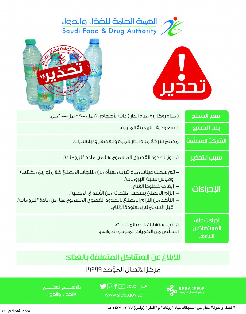 حذّرت الهيئة العامة للغذاء والدواء، من استهلاك مياه "روكان" ومياه "الدار" ذات الأحجام 200 و330 و600 مل، التي ينتجها مصنع مياه الدار للمياه والعصائر والبلاستيك في المدينة المنورة، لتجاوزها الحدود القصوى المسموح بها من مادة البرومات.
