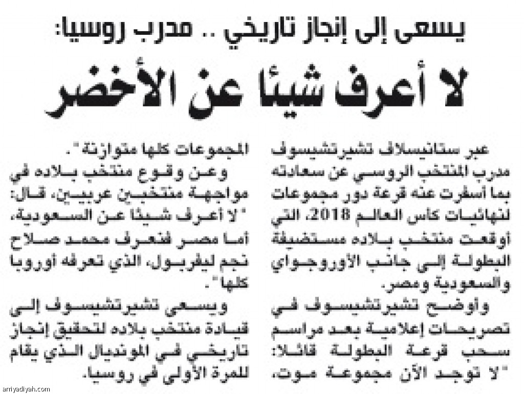 عبر ستانيسلاف تشيرتشيسوف مدرب المنتخب الروسي عن سعادته بما أسفرت عنه قرعة دور مجموعات لنهائيات كأس العالم 2018، التي أوقعت منتخب بلاده مستضيفة البطولة إلى جانب الأوروجواي والسعودية ومصر.