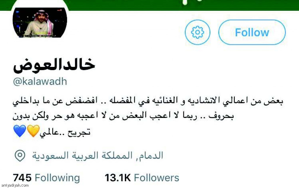 يتميز حساب الشاعر خالد العوض، على موقع التواصل الاجتماعي "تويتر"، بكثير من التغريدات الخاصة بالفريق الذي يشجعه "النصر"، وكذلك إعادة التغريدات التي تخص "النصر"، عشقه للعالمي جعله يكتب روائع من الشعر ممزوجة بالغزل، مع ممازحة مشجعي الأندية الأخرى بكل احترام.