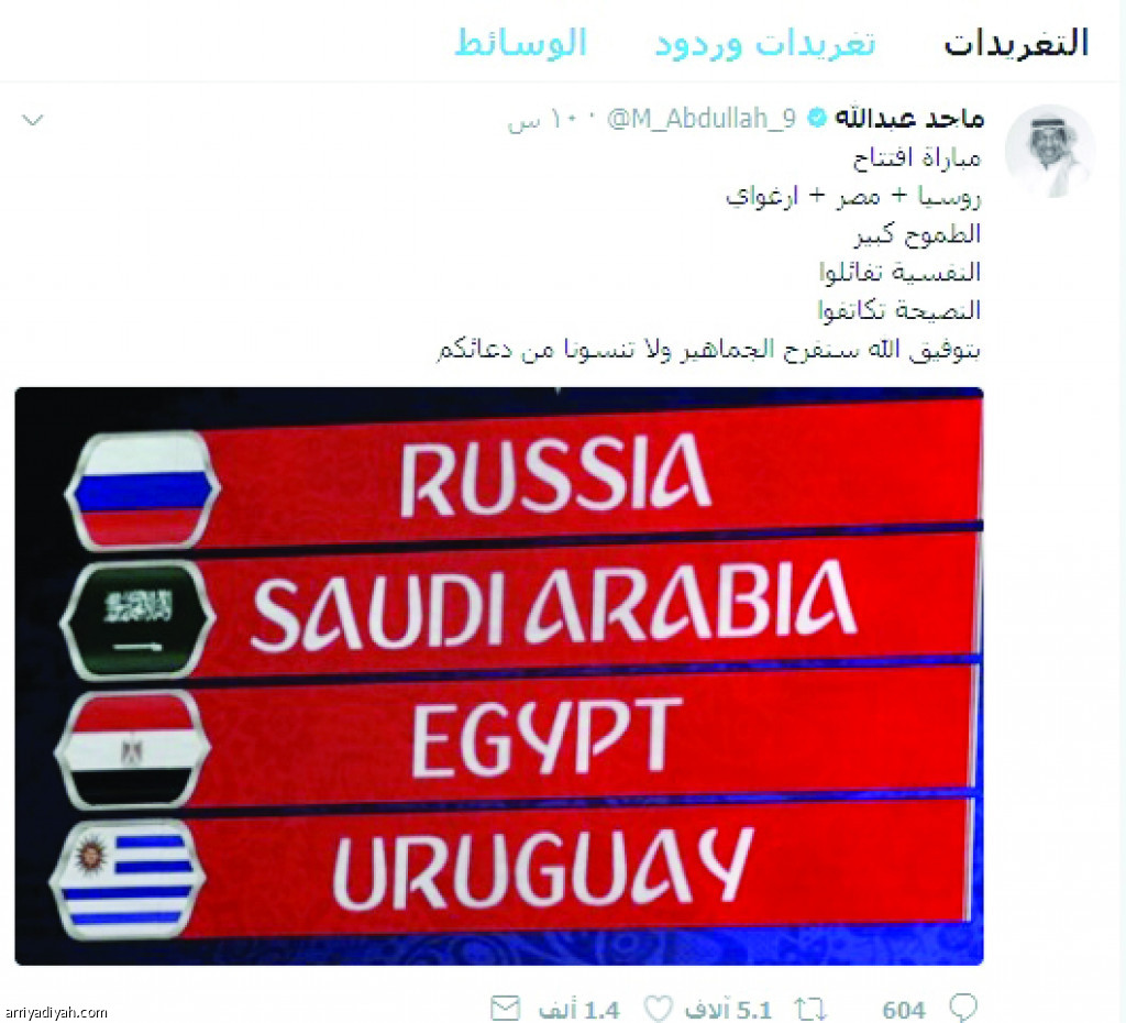 وعلق ماجد قائلاً: مباراة افتتاح روسيا + مصر + أوروجواي، مضيفاً: الطموح كبير، والنفسية تفاءلوا، والنصيحة تكاتفوا بتوفيق الله سنفرح الجماهير ولا تنسونا من دعائكم.