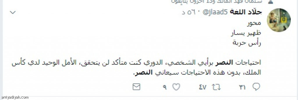 وعلق المغرد جلاد اللغة قائلاً: محور، ظهير يسار، رأس حربة. احتياجات النصر برأيي الشخصي، الدوري كنت متأكداً لن يتحقق، الأمل الوحيد لدي كأس الملك، بدون هذه الاحتياجات سيعاني النصر، فيما قال المغرد سمير عواد: مشاركة جيبور وتأخر دخول الفريدي خطأ فادح من مدرب النصر برأيي، ساهمت جداً بضياع النتيجة، مضيفاً: عمق النصر ممر سالك بفضل سوء غالب في افتكاك أو قطع الكرات، حتى الهدف يتحمله بتأخره في إبعاد الكرة! الجبرين كان الأنسب لـهذه المباراة.