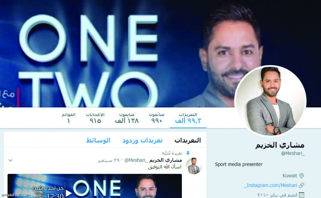 مشاري الخزيم، مقدم برنامج "كي كوف" الإذاعي وبرنامج "ون تو" على قناة atv، بدايتي في الـ"سوشال ميديا" عن طريق "تويتر"، الذي أثر كثيرا في مسيرتي المهنية، حتى أصبحت أكثر اطلاعا، وتغلبت على سلبيات عديدة، إضافة إلى أن الأخبار تصل إلي أولا بأول بحكم عملي في التلفزيون، وتخصصي في الكرة العالمية والأوروبية.