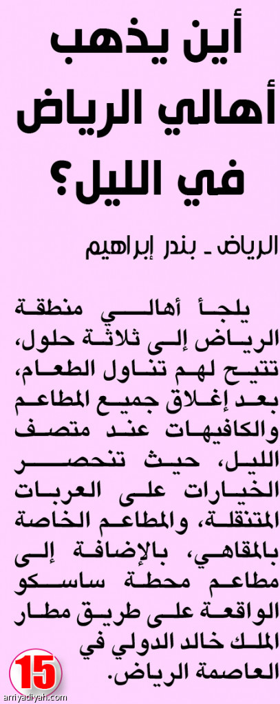 يلجأ أهالــي منطقة الرياض إلى ثلاثة حلول، تتيح لهم تناول الطعام، بعد إغلاق جميع المطاعم والكافيهات عند متصف الليل، حيث تنحصـــر الخيارات على العربات المتنقلة، والمطاعم الخاصة بالمقاهي، بالإضافة إلى مطاعم محطة ساسـكو الواقعة على طريق مطار الملك خالد الدولي في العاصمة الرياض.