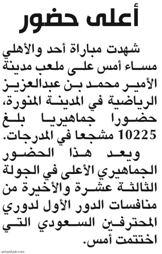 شهدت مباراة أحد والأهلي مساء أمس على ملعب مدينة الأمير محمد بن عبدالعزيز الرياضية في المدينة المنورة، حضورا جماهيريا بلغ 10225 مشجعا في المدرجات.
