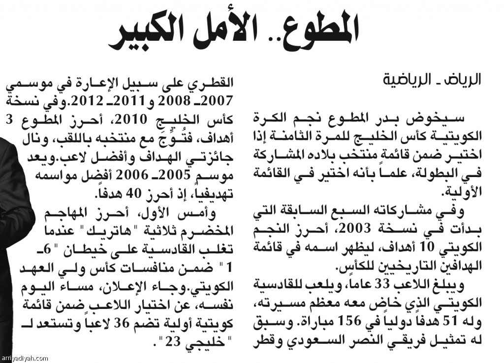 سيخوض بدر المطوع نجم الكرة الكويتية كأس الخليج للمرة الثامنة إذا اختير ضمن قائمة منتخب بلاده المشاركة في البطولة، علماً بأنه اختير في القائمة الأولية.