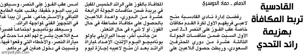 رفضت إدارة نادي القادسية منح لاعبي فريقهم الأول لكرة القدم مكافآت خاصة عقب الفوز على النصر ٣ـ٢ أمس الأول السبت ضمن منافسات الجولة الثالثة عشرة من دوري المحترفين السعودي، وربطت حصول اللاعبين على المكافأة بالفوز على الرائد الخميس المقبل في بريدة ضمن منافسات الجولة الرابعة عشرة من الدوري، واعدة اللاعبين بالحصول على مكافأة مضاعفة في حال الفوز، أو لا شيء في حال التعثر.